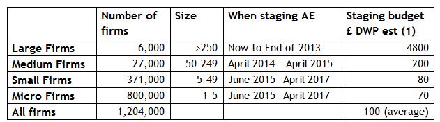 The source for this information is the Pension Regulator and the Department of Work and Pensions. The number of firms and their size rely on the small and medium size enterprise statistics; 2007. How the DWP estimated the staging budgets is not clear.